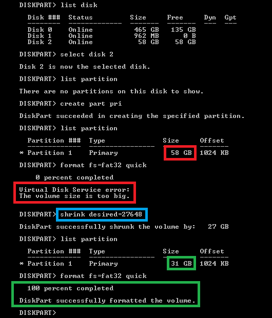 You may encounter the following message you try to format with DiskPart a FAT32 partition bigger than 32 Gb.