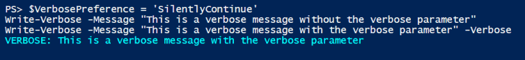 $VerbosePreference = 'SilentlyContinue' Write-Verbose -Message "This is a verbose message without the verbose parameter" Write-Verbose -Message "This is a verbose message with the verbose parameter" -Verbose