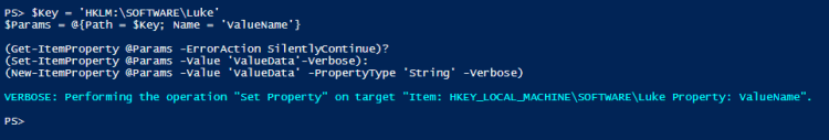 (New-ItemProperty @Params -Value 'ValueData' -PropertyType 'String' -Verbose)